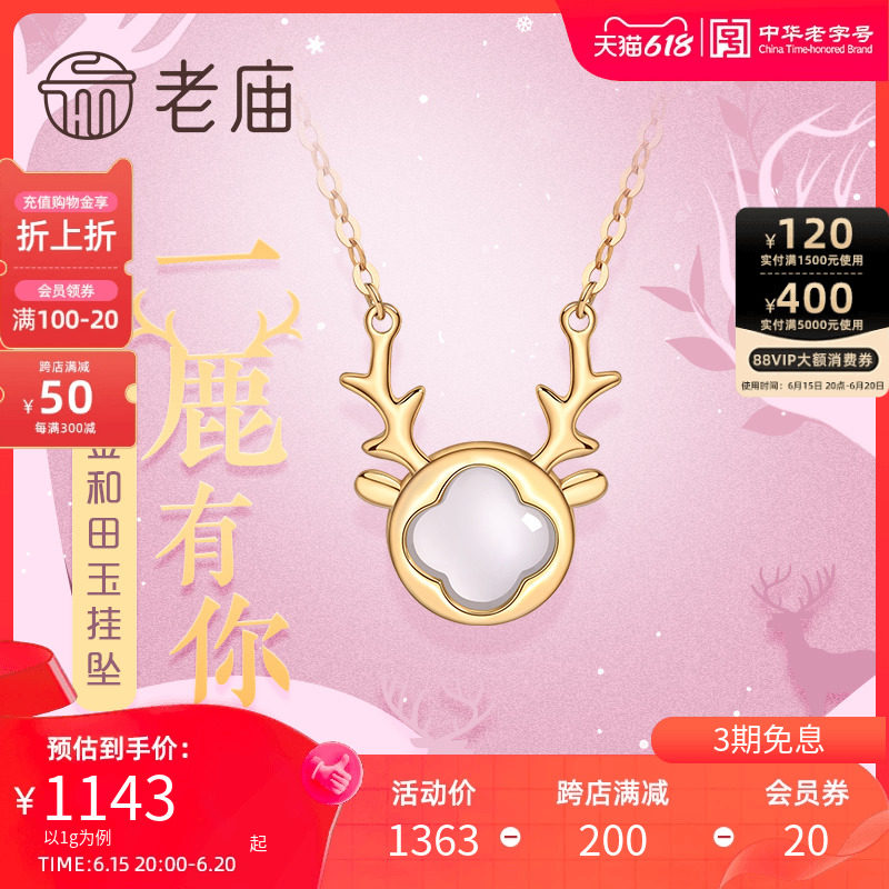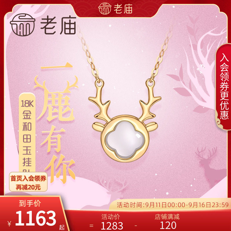券 20元销量3老庙黄金18K和田玉白玉金镶玉麋鹿一路有你K金项链吊坠挂坠女送礼