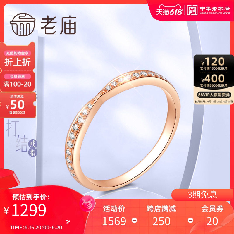 券 20元销量3老庙黄金彩18K金戒指钻戒条戒百搭固口戒生日礼物送女友礼物正品