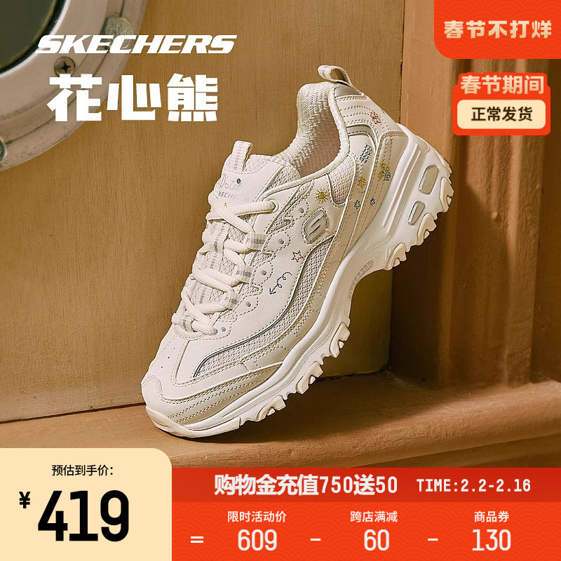 券 140元销量600Skechers斯凯奇女子花心熊刺绣熊猫鞋休闲老爹鞋