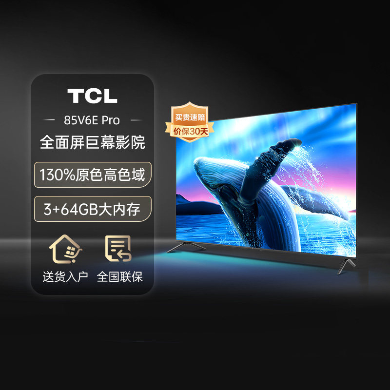 券 300元销量3【阿里官方自营】TCL电视机 85V6E Pro 85英寸4K高色域全面屏电视
