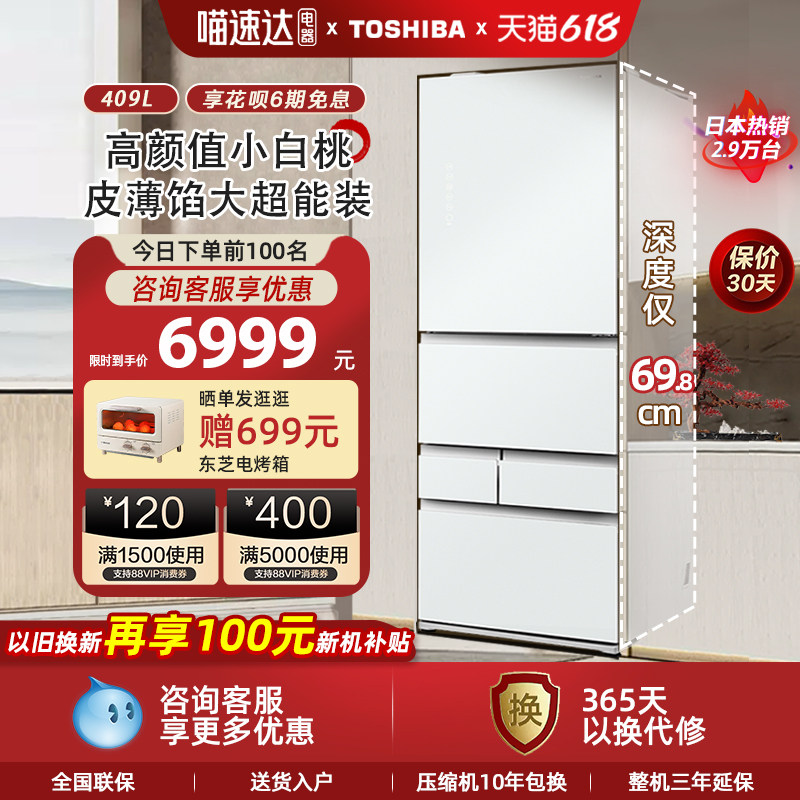 券 2800元销量1000东芝429多门小户型大容量变频自动制冰风冷无霜超薄冰箱小白桃