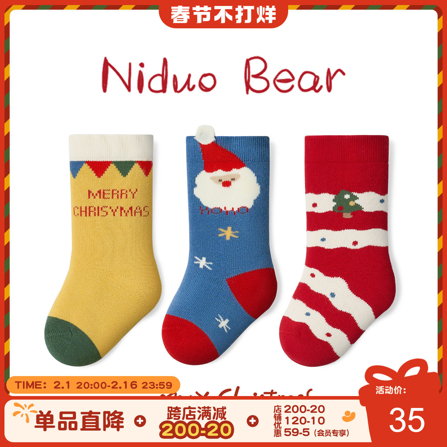 券 5元销量100尼多熊婴儿圣诞袜子冬加厚加绒保暖毛圈袜宝宝圣诞节儿童袜中筒袜