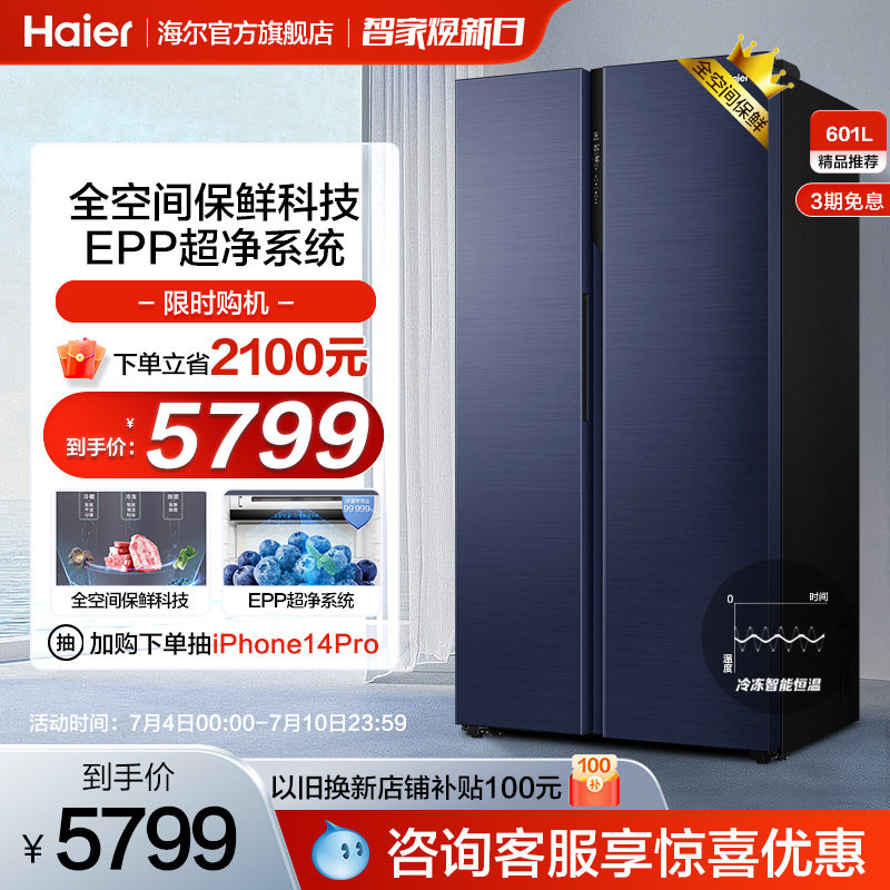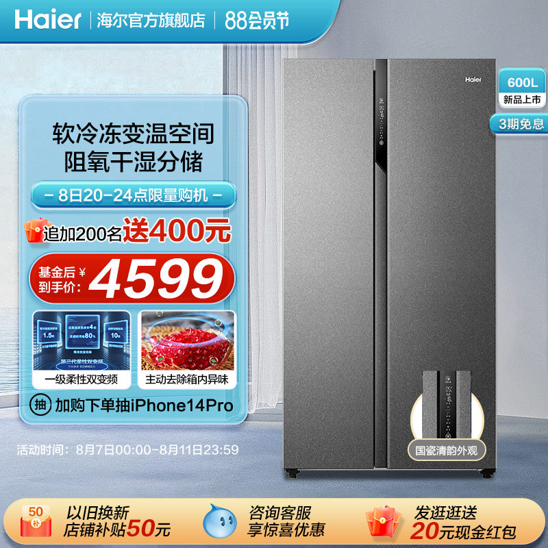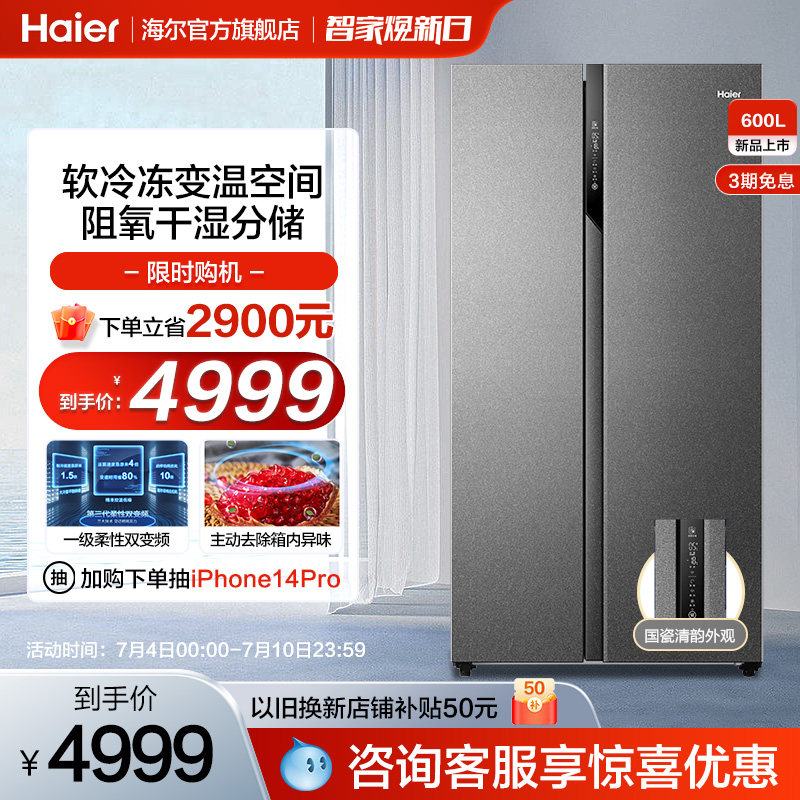 券 500元销量100海尔600L对开双开门电冰箱家用大容量干湿分储风冷无霜官方旗舰店