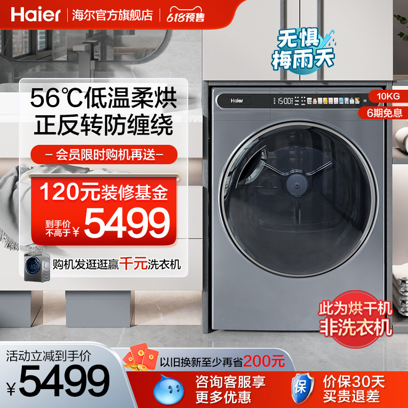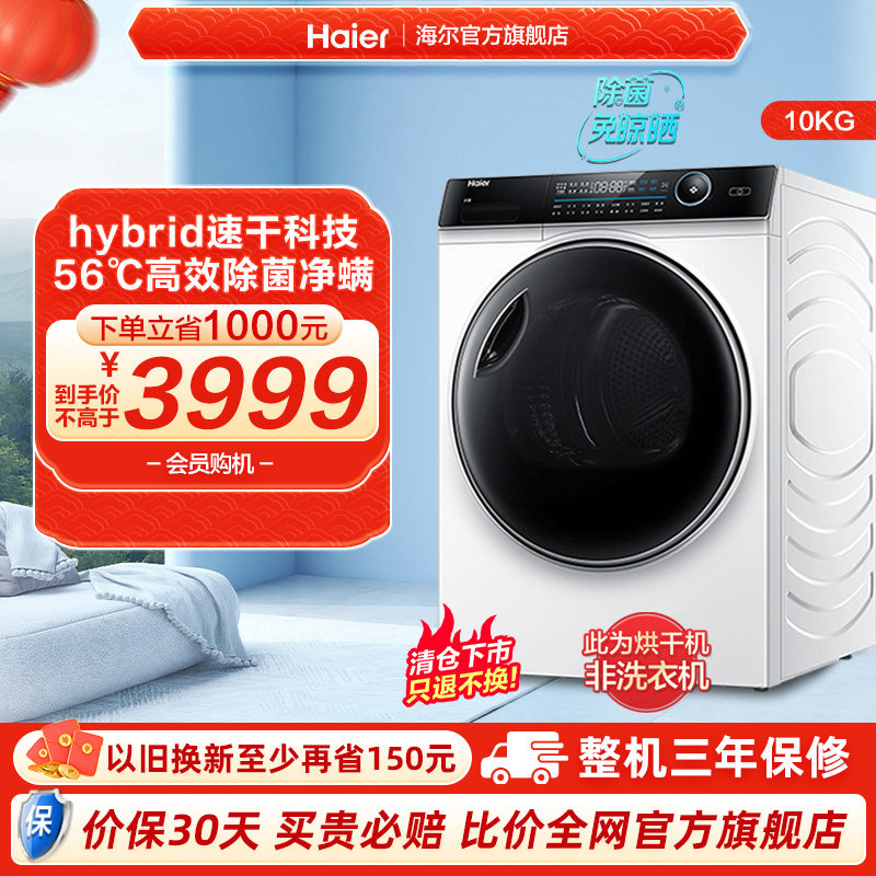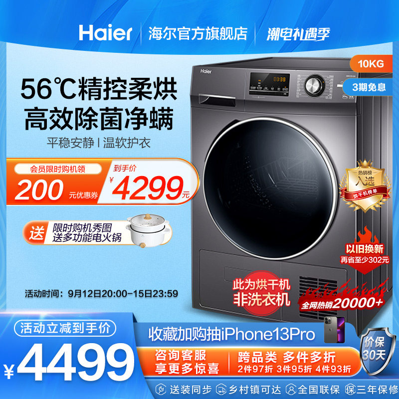 券 300元销量48【热泵】海尔10公斤大容量家用全自动滚筒烘干机干衣机除菌螨636