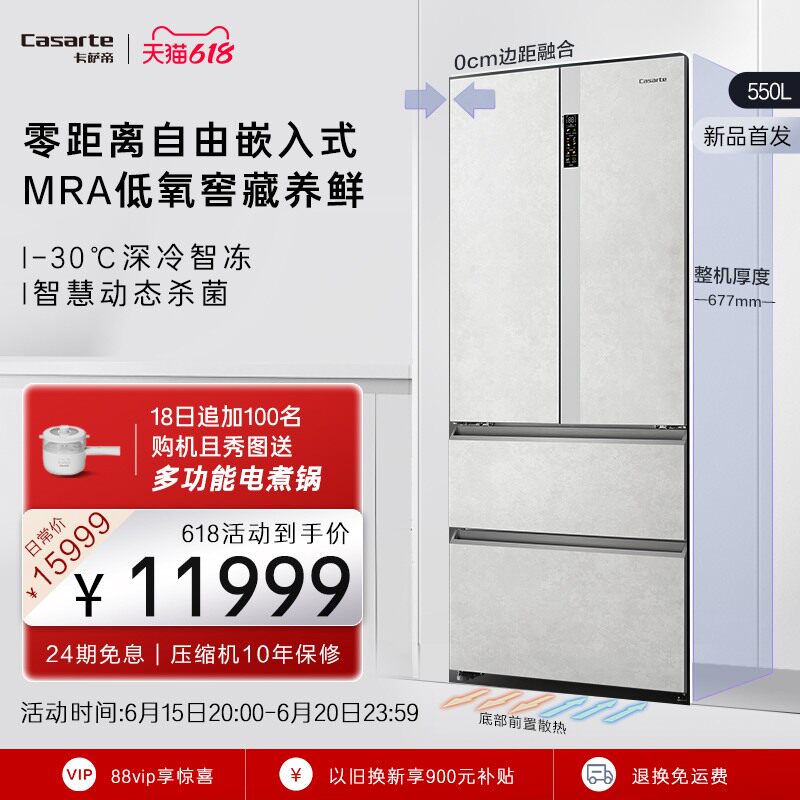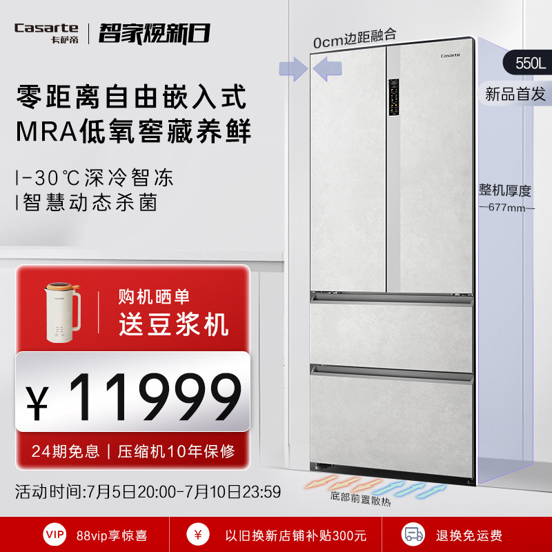 券 300元销量500【零嵌】卡萨帝550L嵌入式灰白色四门超薄一级风冷无霜家用冰箱