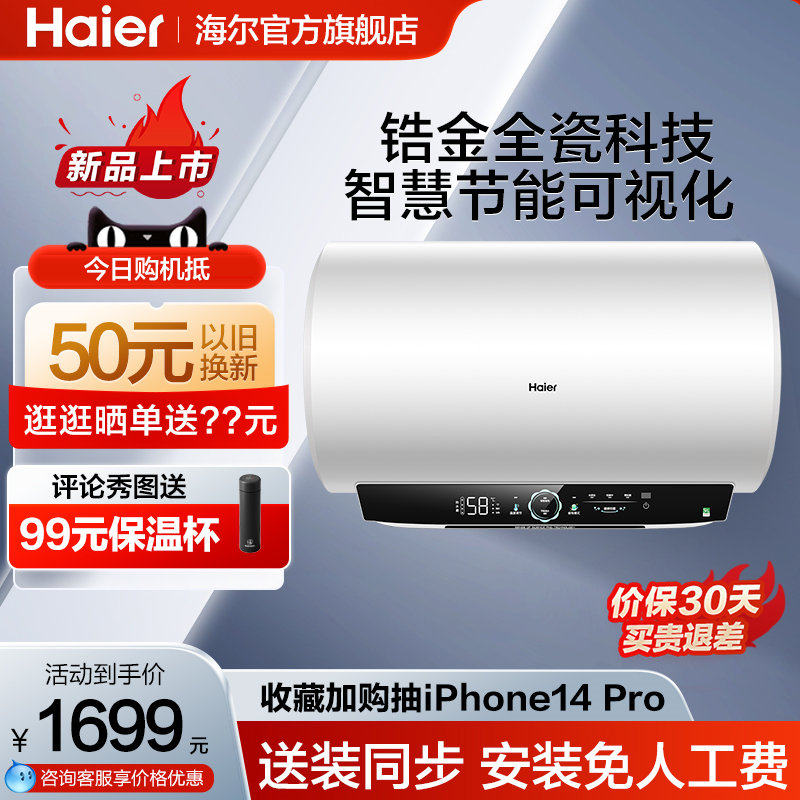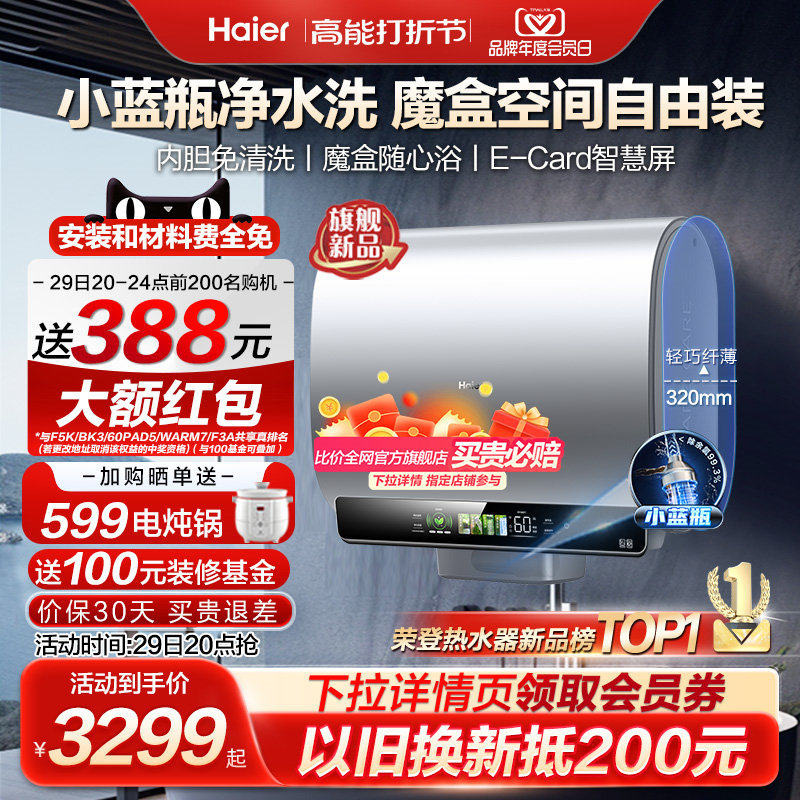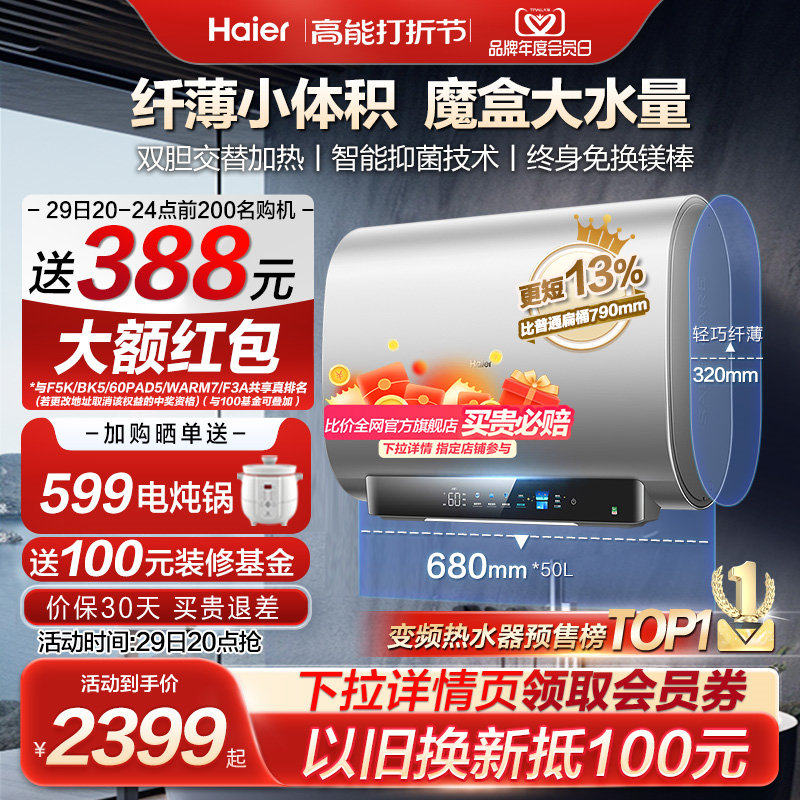 券 200元销量700海尔家用电热水器洗澡除氯净水洗双胆扁桶60升80L一级节能变频BK5