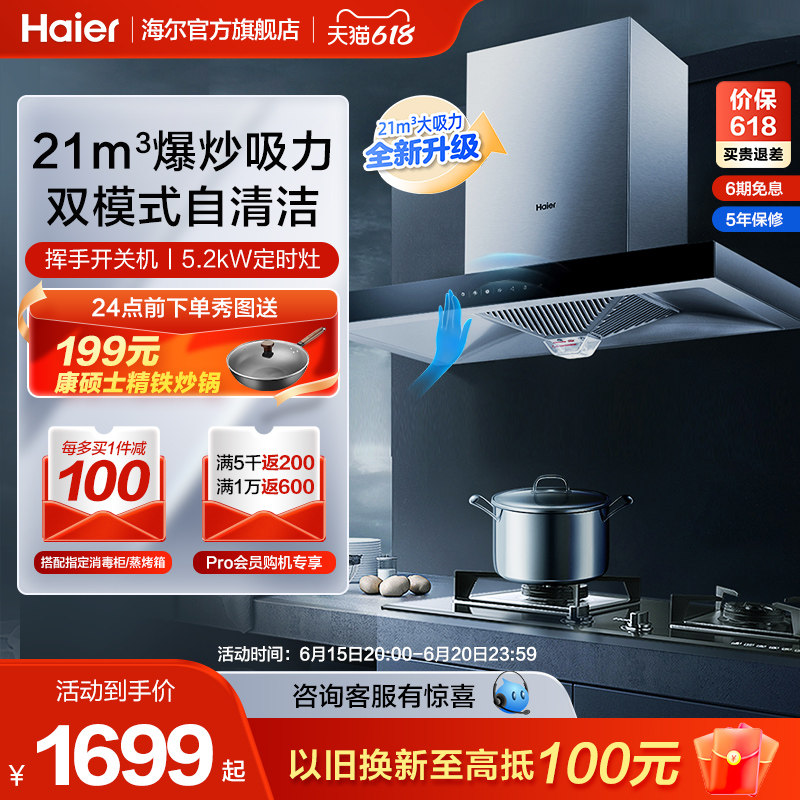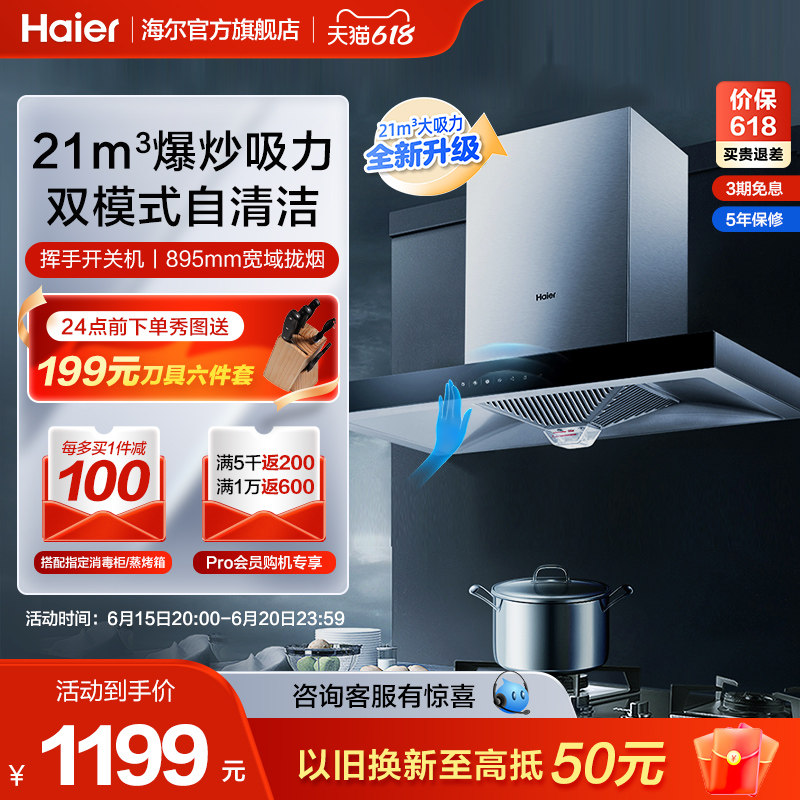 券 1090元销量29【优价好货】海尔抽油烟机T11顶吸式欧式脱排自清洁租房家用厨房