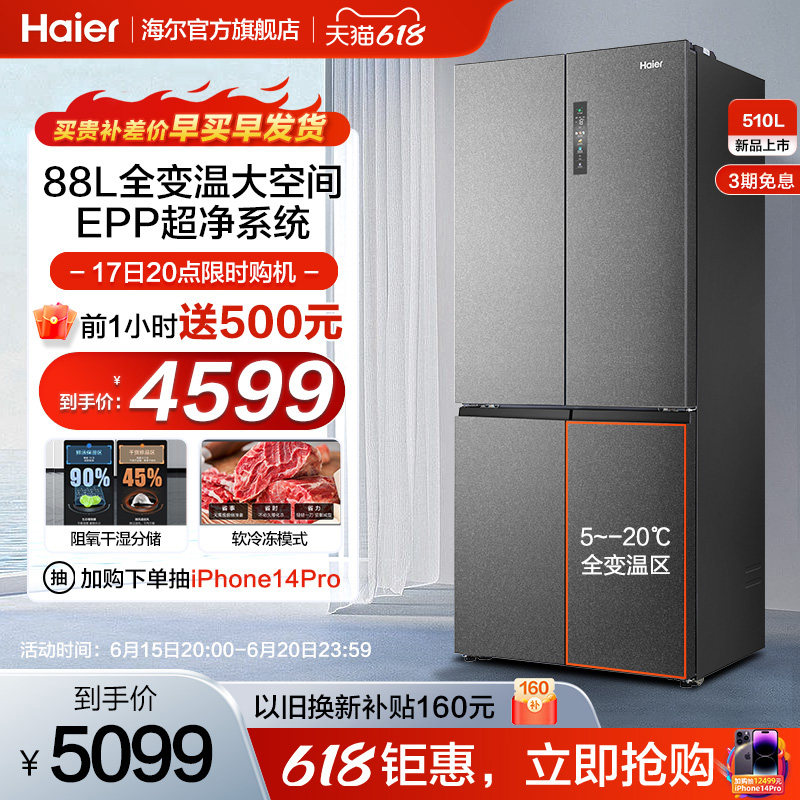 券 300元销量1000海尔510L大容量十字对开四门嵌入式冰箱变频一级变频风冷超薄家用