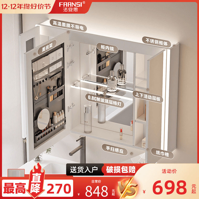 券 28元销量0法安思智能镜柜定制卫生间通顶挂墙式镜子浴室单独加长储物柜定做