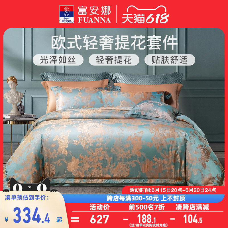 券 10元销量600富安娜家纺纯棉提花四件套轻奢全棉床单床笠被套欧式床上用品套件