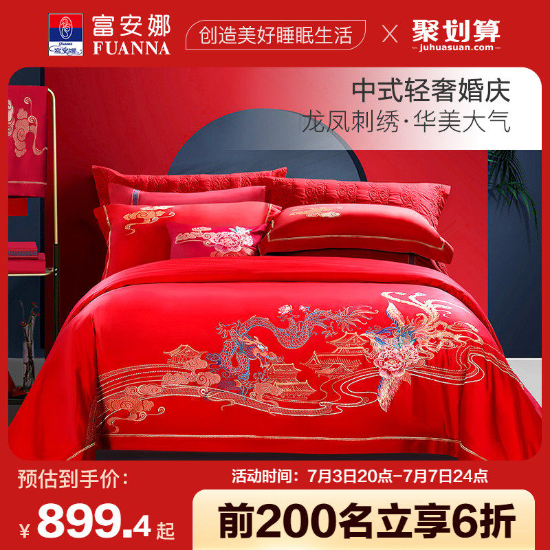 券 10元销量100富安娜家纺60支长绒棉婚庆六件套大红色结婚被套喜被婚礼床上用品