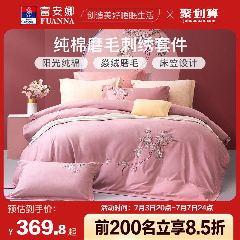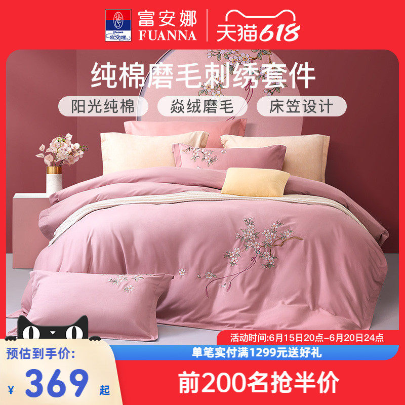 券 10元销量100富安娜家纺磨毛四件套全棉纯棉被套床单秋冬季加厚床笠床上用品