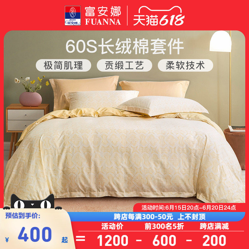 券 10元销量400富安娜家纺60支长绒棉四件套全棉纯棉床单被套极简春夏床上用品