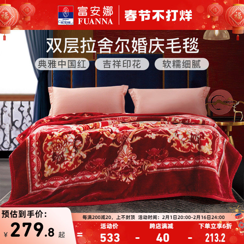 券 10元销量400富安娜双层云毯结婚拉舍尔毛毯婚庆红色加厚盖毯冬季毯子双人绒毯