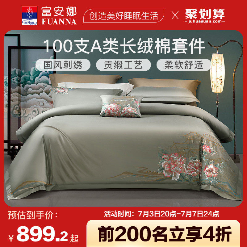 券 10元销量100富安娜家纺四件套纯棉全棉100支长绒棉A类床单被套春夏床上4件套