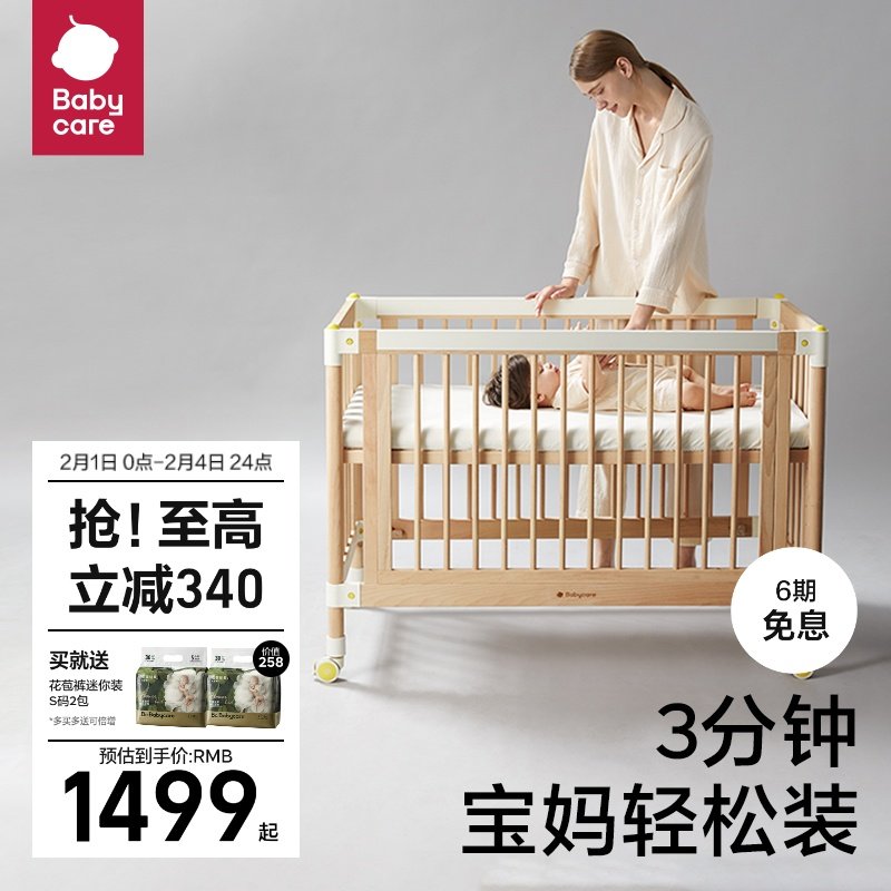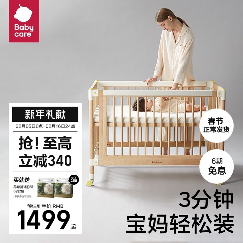 券 200元销量100babycare婴儿床拼接大床实木无漆床可移动新生多功能儿童床宝宝床