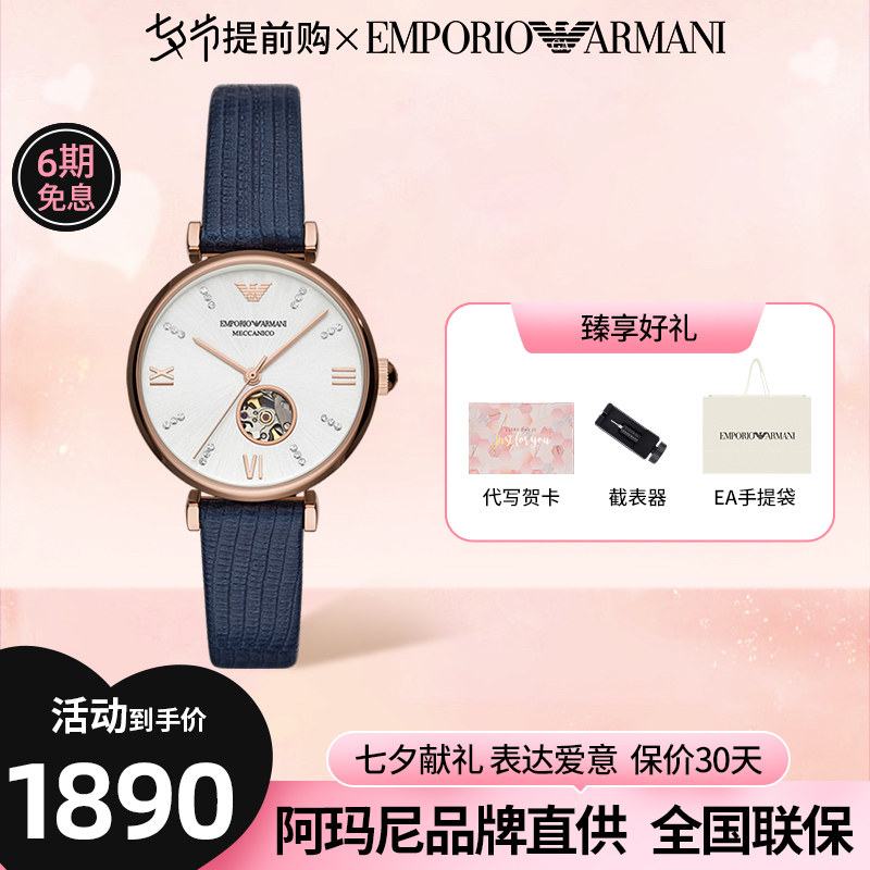 券 600元销量6[专柜同款]阿玛尼手表女 正品小众臻蓝镂空机械表防水女表AR60020