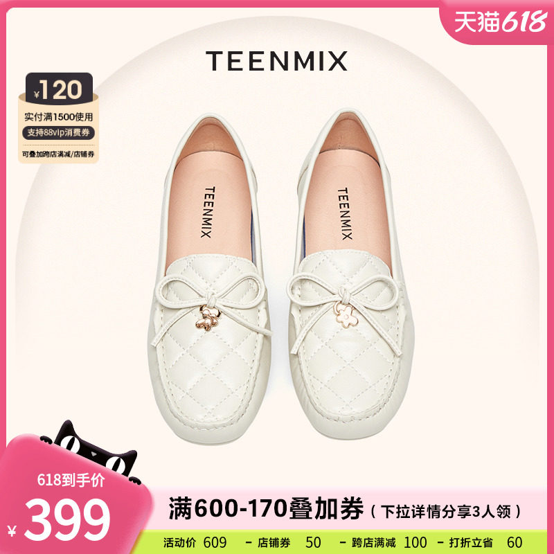券 100元销量100天美意通勤乐福浅口单鞋女鞋豆豆鞋一脚蹬皮鞋子2023春新AG007AQ3