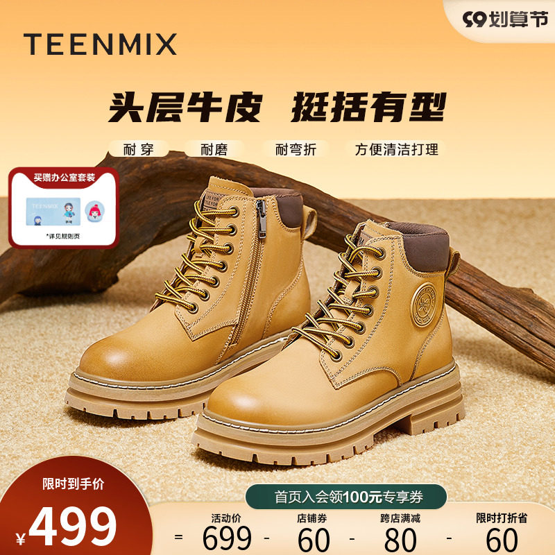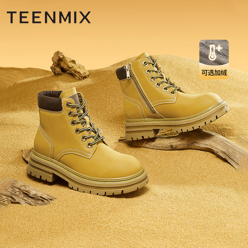 券 60元销量1000天美意厚底马丁靴大黄靴女2022冬季新款复古工装靴短靴子NGX03DD2