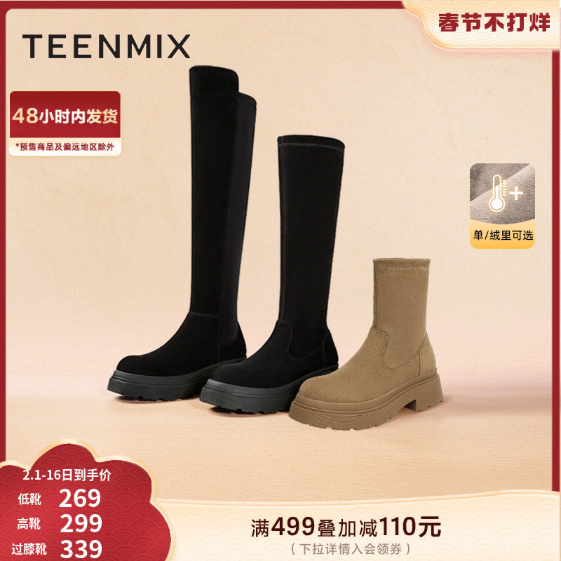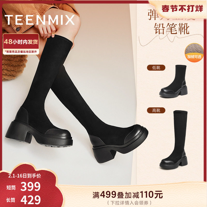 天美意复古厚底加绒弹力时装靴短靴女鞋子瘦瘦靴长筒靴2023冬新款