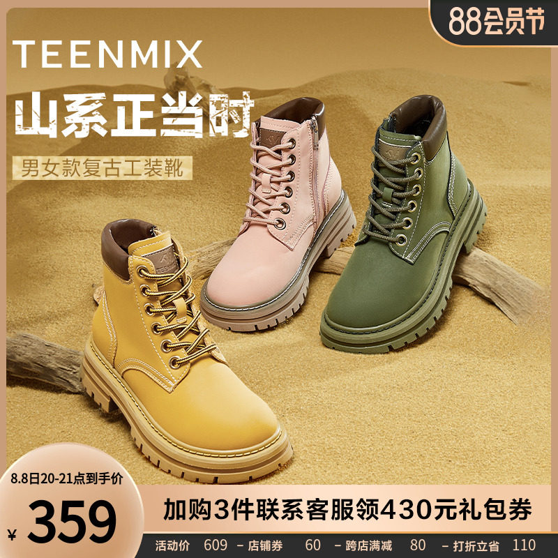 券 120元销量100天美意厚底大黄靴英伦风马丁靴子男女工装复古靴子短靴皮靴新款
