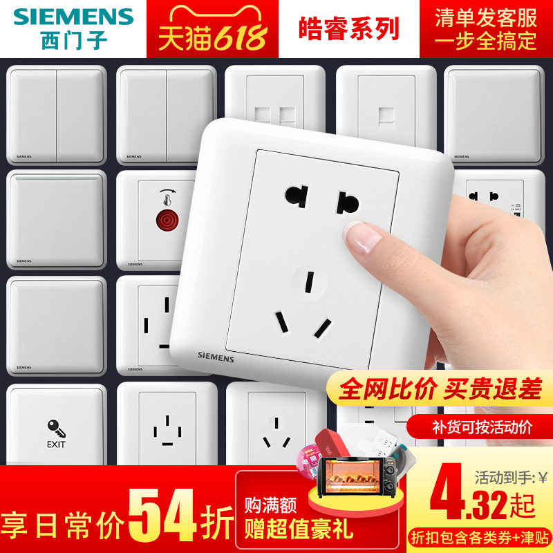券 2元销量100西门子开关插座面板皓睿白色86型墙壁暗装多五孔家用电源全屋套餐