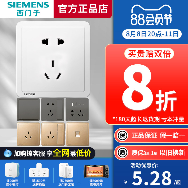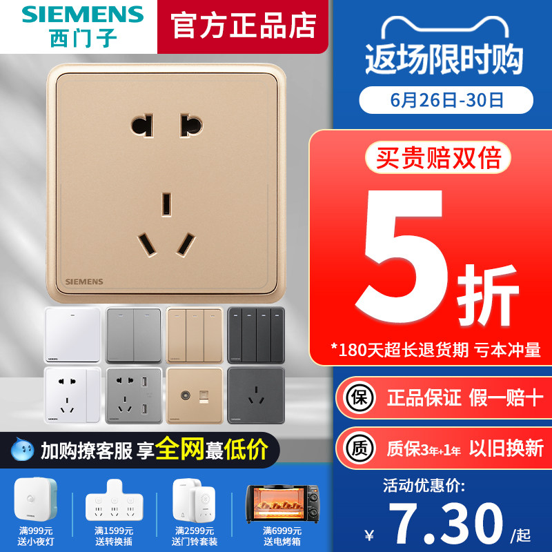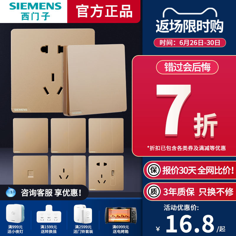 券 1元销量12西门子三开双控开关带荧光致典日曜金色86型家用墙壁家用全屋套餐
