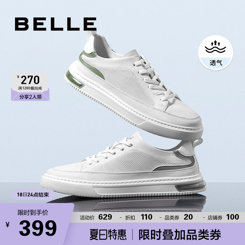 券 140元销量500百丽男鞋夏季透气打孔小白鞋男新款真皮厚底运动休闲板鞋A0658AM2