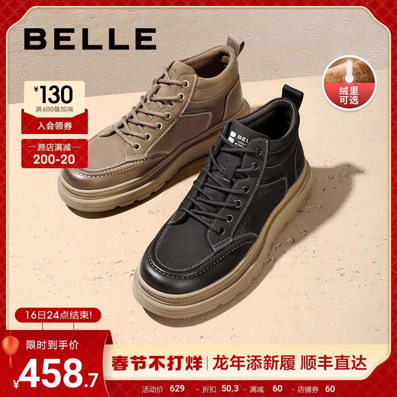 券 60元销量100百丽男鞋秋冬款2023新款休闲高帮板鞋子男厚底加绒百搭A1307DD3
