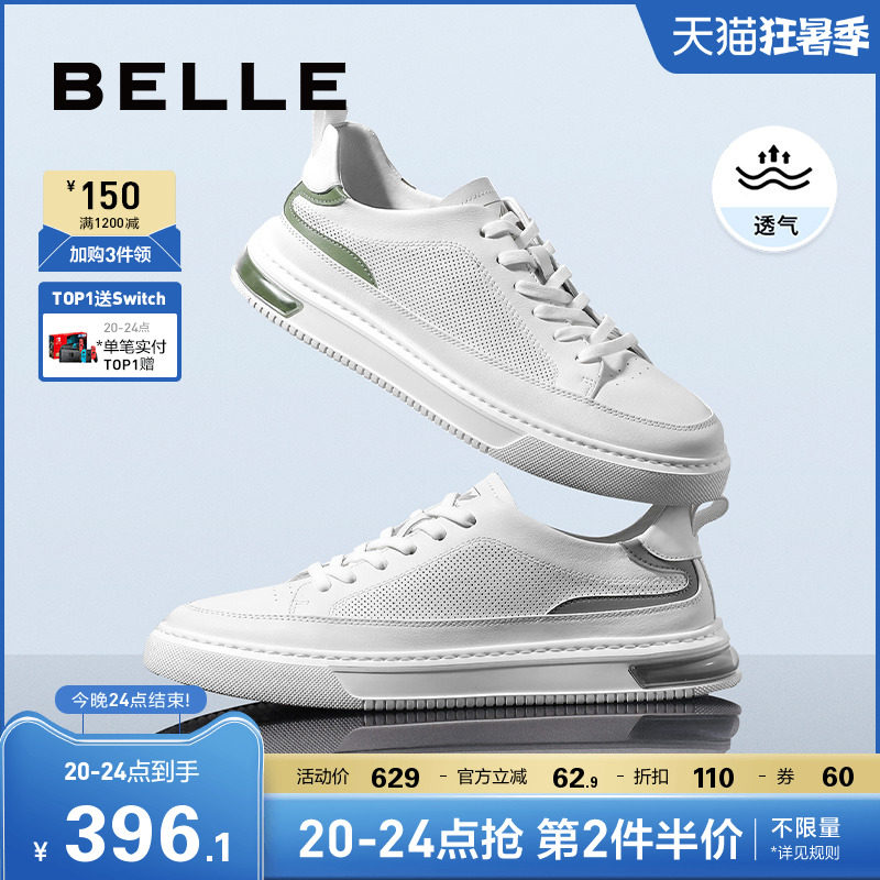 券 120元销量0百丽男鞋打孔夏季透气小白鞋男2023新款真皮厚底休闲板鞋A1122BM3
