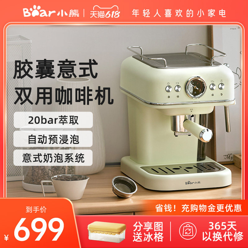 券 300元销量1000小熊意式咖啡机办公室自动蒸汽奶泡拉花家用高压式萃取胶囊咖啡壶